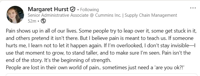 Meet Margaret Hurst. Senior Administrative Associate at Cummins Inc. Margaret Hurst’s recent LinkedIN post about pain shaping us into stronger souls feels like a slap in the face when you know the truth about Cummins Inc. She’s all poetic about leaping over hurt and asking if we’re okay, but her company’s track record with mental health is a goddamn disgrace. Let’s rip the mask off this hypocrisy.